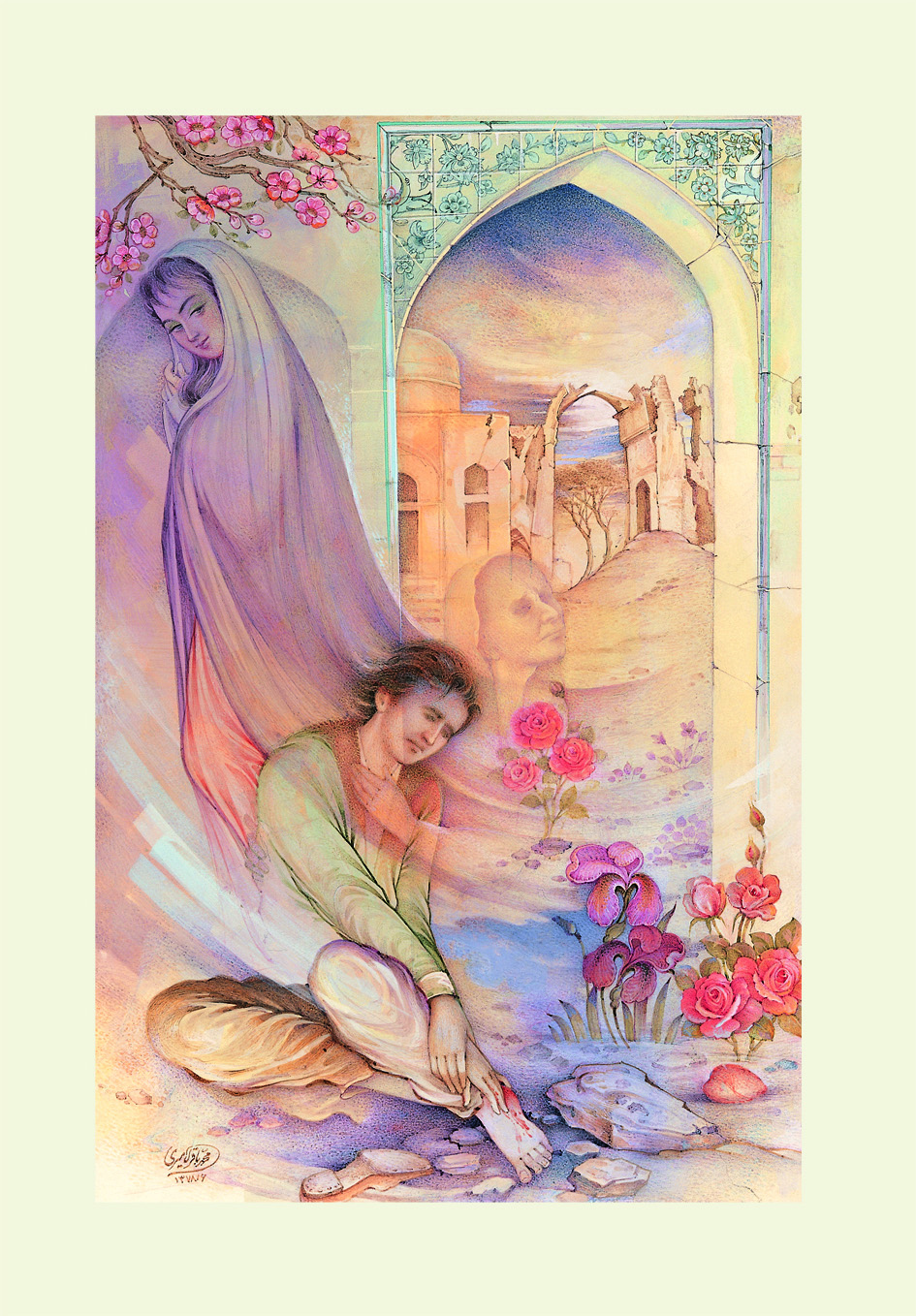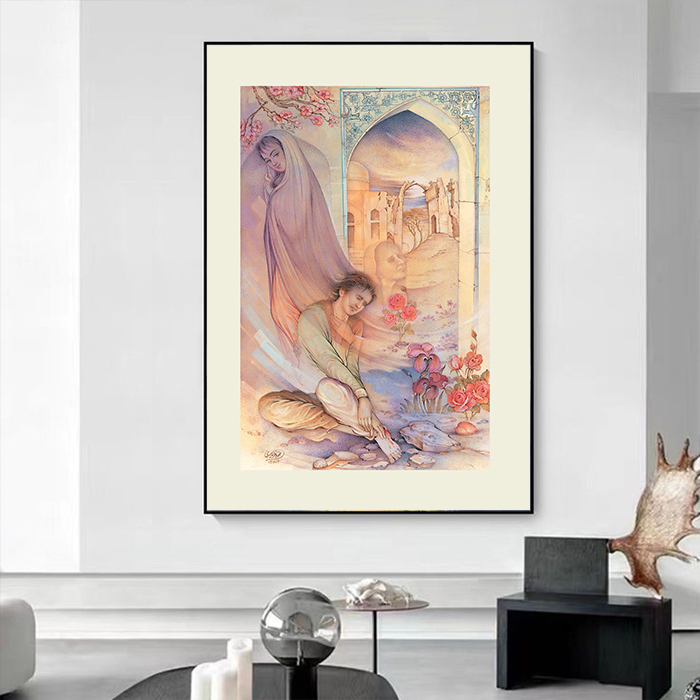In The Goddess of Love Mother, Aghamiri merges delicate details with spiritual depth, portraying a symbolic embodiment of love and nurturing. The graceful composition and harmony of colors reflect both the timeless beauty of Persian miniature art and the profound emotional resonance of the subject